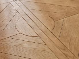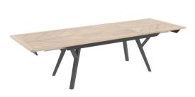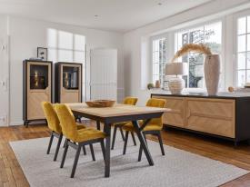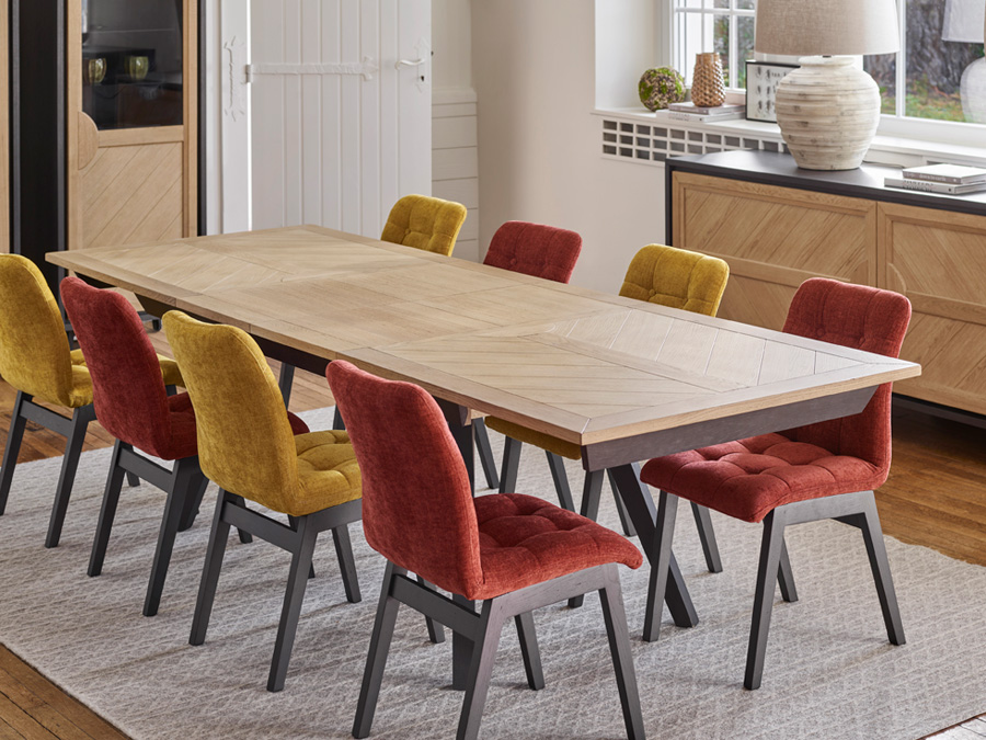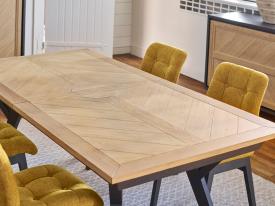 - Dessus et allonge épaisseur 26 mm : panneaux centraux en médium plaqué chêne et rives en chêne massif.