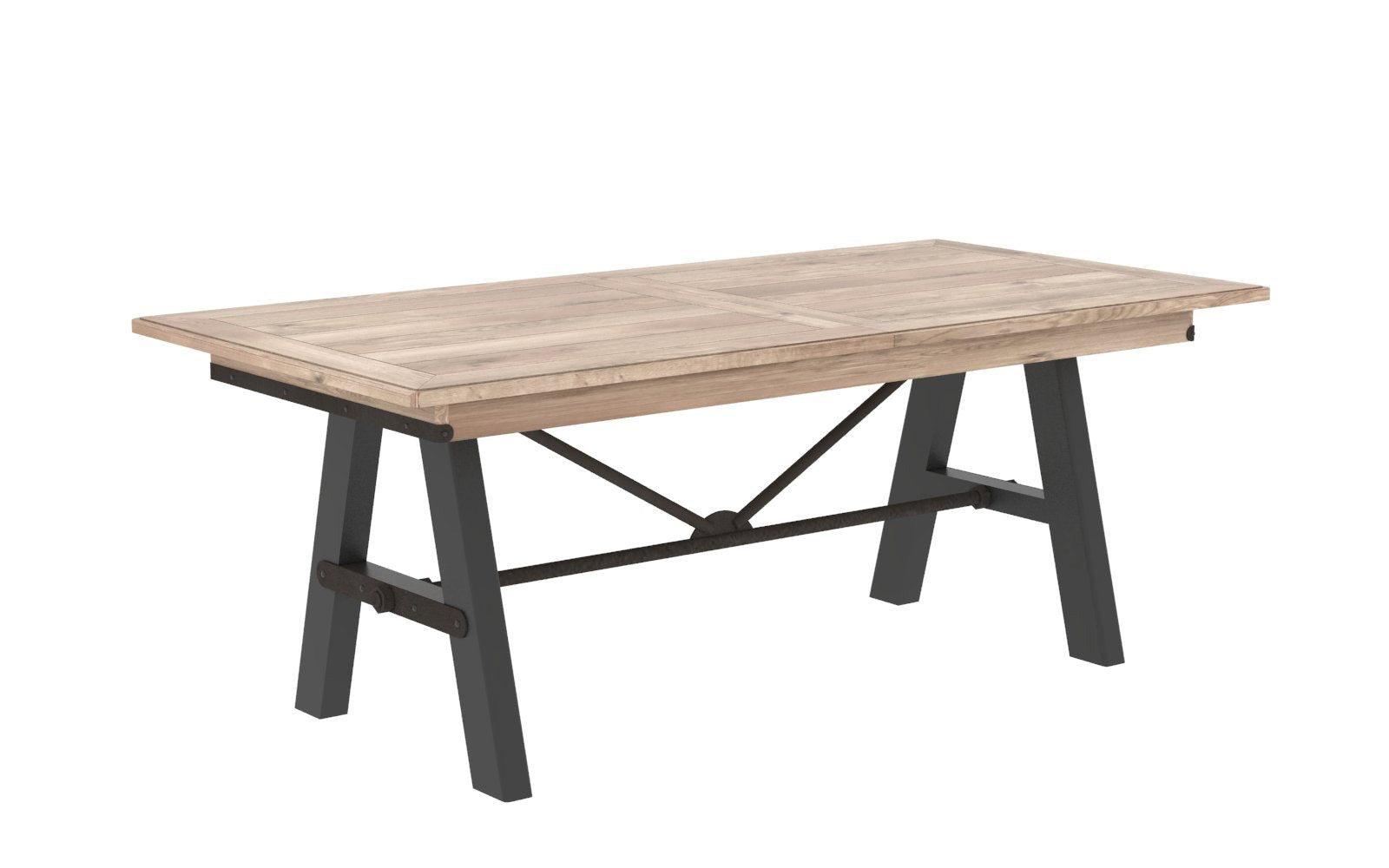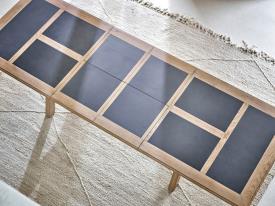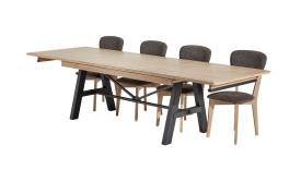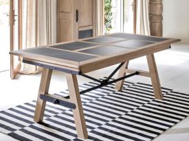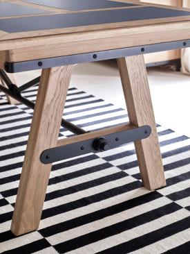 Ateliers de Langres Réf. INT170B Dimensions : l 170 x h 76 x p 100 cm Y compris 1 allonge portefeuille 60 cm -> L 230. Détails : - Dessus et allonge épaisseur 27 mm : panneaux centraux en médium plaqué chêne rainurés tous les 13 cm et rives en chêne massif. - Coulisses métalliques synchronisées. - Pieds en chêne massif (entre pieds 114 cm). - Ceintures en chêne massif. - Décors, barres et boulons en métal thermolaqués noir mat RAL 9011. table allonge