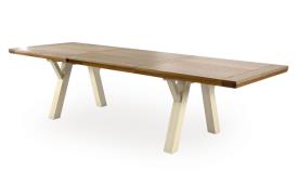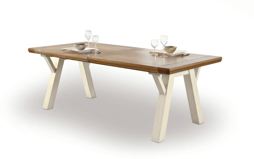Ateliers de Langres Réf. ROTRE210 Dimensions : l 210 x h 77 x p 100 cm Y compris 1 allonge portefeuille 60 cm -> L 235. Entre pieds : 120 cm. Détails : - Dessus & allonges en chêne massif. - Pieds en chêne massif. - Ouverture par le milieu, coulisses métalliques synchronisées. table allonge