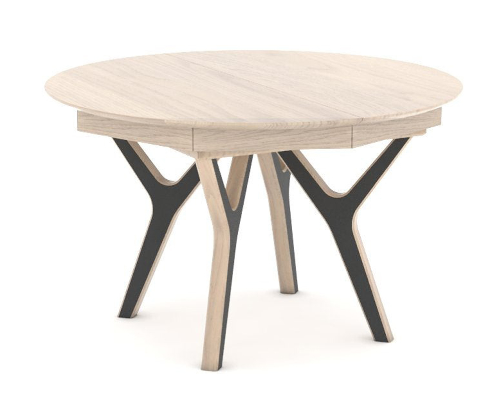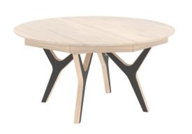Ateliers de Langres Réf. NETR125 Dimensions : l 125 x h 77 x p 125 cm Table en chêne massif, certifiée Origine France Garantie. Y compris 1 allonge portefeuille 50cm -> L 175. Distance entre pieds au sol 52 cm. Détails : - Coulisses métalliques synchronisées. - Dessus et allonge épaisseur 25 mm, en médium alaisé et plaqué chêne. - 4 pieds chêne épaisseur 50 mm, chants et chanfreins toujours laqués noir mat. table ronde
