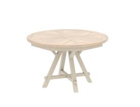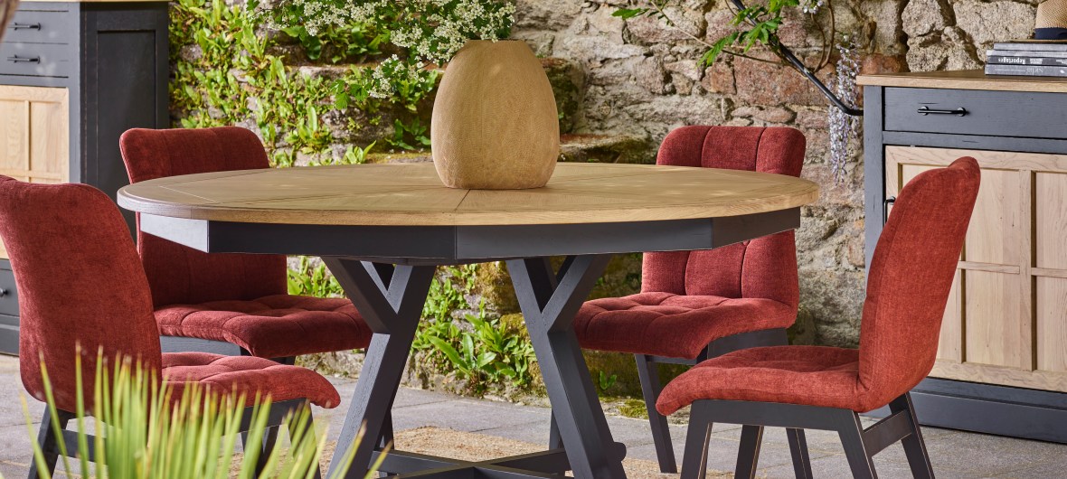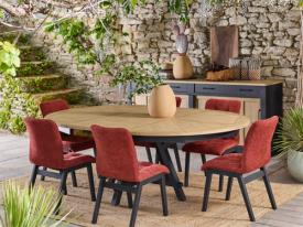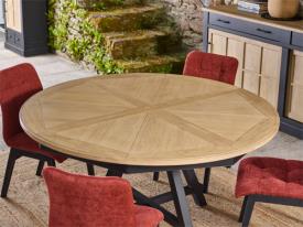 Ateliers de Langres Réf. ODTR125 / ODTR150 Dimensions : l 125/150 x h 77 x p 125/150 cm Table en chêne massif, certifiée Origine France Garantie. Y compris 1 allonge portefeuille 50 cm -> L 175. Détails : - Dessus et allonge épaisseur 27 mm : panneaux centraux en médium plaqué chêne et rives en chêne massif. - Coulisses métalliques synchronisées. - Pieds en chêne massif. - Ceintures en chêne massif. - Empattement hors tout : 65 cm d'un pied à l'autre et 87 cm au pied opposé. table ronde avec allonge