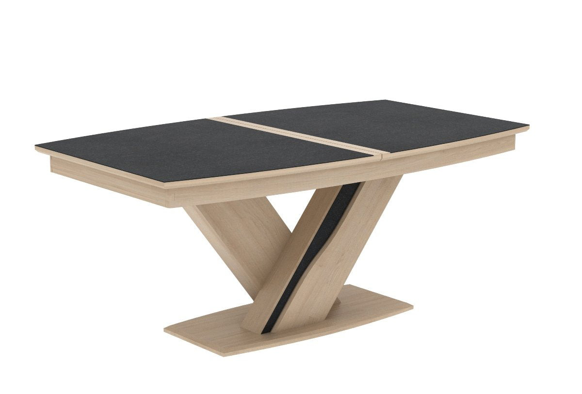 Ateliers de Langres Réf. 470XTPF Dimensions : l 180 x h 77 x p 105 cm Y compris 1 allonge portefeuille 80cm -> L 260. Détails : - Largeur bout plateau 87cm, Hauteur 77cm, Sous ceinture 66cm. - Socle bas 98 x 48 cm, 39cm en bout, insert céramique sur pied. - Céramique collée sur médium de 22 mm. - Ouverture par le milieu, coulisses métalliques synchronisées. - Allonge avec céramique collée sur médium de 22 mm. table allonge