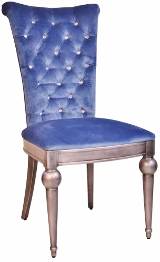 Paget Dimensions : l 50 x h 98 x p 60 cm Chaise déco et tendance, sa boiserie couleur métal brossé est surlignée par un tissu bleu et des boutons brillants. Structure hêtre massif. Chaise contemporaine dossier tapissé. Assise amovible. Chaise personnalisable: coloris du bois et revêtements aux choix dans une vaste gamme.