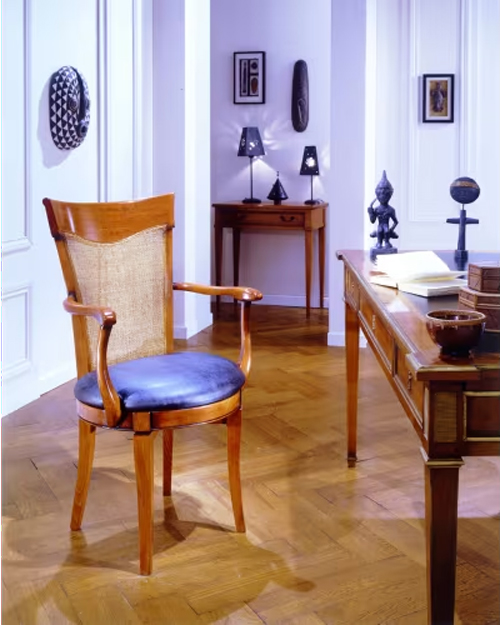 Paget Dimensions: l 53 x h 100 x p 45 cm fauteuil de bureau en bois avec un dossier canné qui assure une ergonomie très enveloppante. Fauteuil en hêtre massif. Siège personnalisable: coloris du bois (code RAL possible) et revêtements aux choix dans une vaste gamme. Assise amovible. Siège confortable pour: salon, réception, hall d'entrée, salle à manger, bureau.