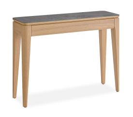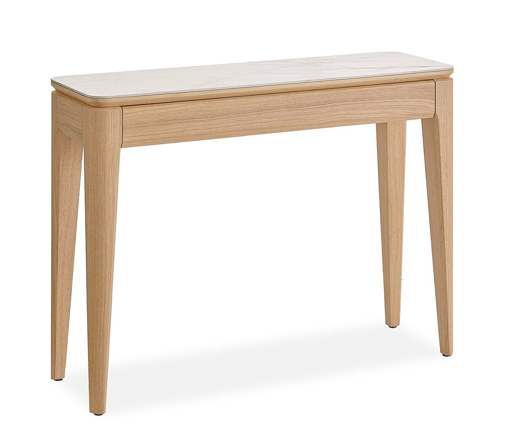 Girardeau Réf. 191200 / 191201 Dimensions : l 115 x h 84,5 x p 36 cm Céramique sur le plateau Tiroir : fermeture avec amortisseur Pieds chêne massif L.: 115 – H.: 84,5 – P.: 36 – 28 kgs Portes bois : Panneaux de fibres moyenne densité revêtus de placage chêne avec incrustation céramique brun panaché (Dekton) ou beige veiné. Côtés : Panneaux de particules revêtus de placage chêne. Dessus : Panneaux de particules revêtus de céramique brun panaché (Dekton) avec emboitures en panneaux de fibres moyenne densité revêtus de placage chêne. Derrières, séparations, fonds et tablettes : Panneaux de particules revêtus de placage chêne. Tiroirs : Caisses en panneaux de particules revêtus de placage chêne. fonds en panneaux de fibres moyenne densité revêtus de placage chêne. Pieds : Pieds fer finition époxy gris anthracite. Finition : teinte acrylique – vernis de finition acrylique. console 1 tiroir
