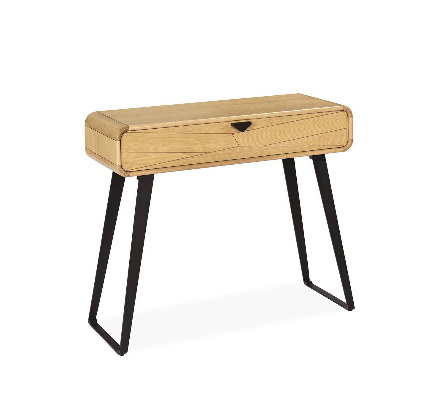 Girardeau Réf. 205800 Dimensions : l 100 x h 36 x p 82,5 cm Console – 1 tiroir Décor façon « chevron » sur le tiroir Pieds fer finition époxy Porte : fermeture avec amortisseurs L.:100 – H.: 82,5 – P.: 36 – 25 kgs Portes : panneaux de particules revêtus de placage chêne avec décor façon « chevron ». Côtés : panneaux de particules revêtus de placage chêne. Dessus : panneaux de particules revêtus de placage chêne. Arrondis dans les angles : chêne massif. Derrières, séparations, fonds et tablettes : panneaux de particules revêtus de placage chêne. Tiroirs : caisses en panneaux de particules revêtus de placage chêne, fonds en panneaux de fibres moyenne densité revêtus de placage chêne. Pieds : pieds fer finition époxy.