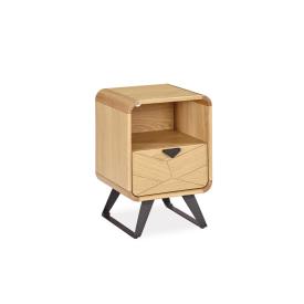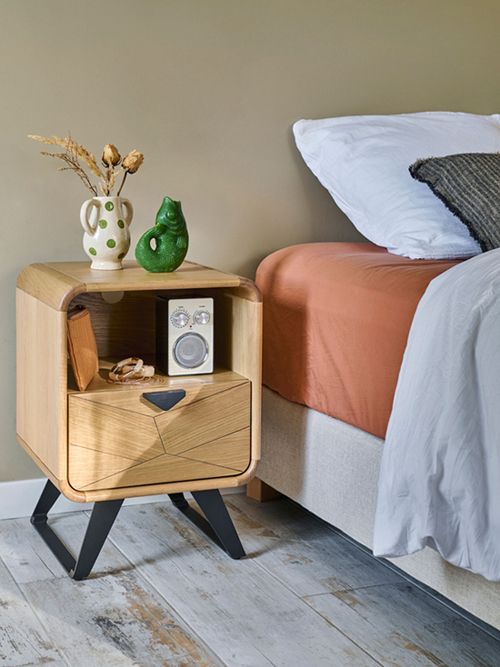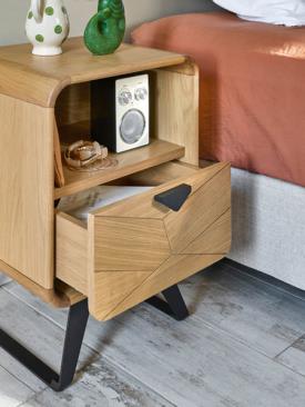 Girardeau Réf. 200300 Dimensions : l 40 x h 56,5 x p 36 cm Chevet – 1 tiroir – 1 niche Décor façon « chevron » sur le tiroir Pieds fer finition époxy Tiroir : fermeture avec amortisseurs 1 niche dimensions au passage : L.:36,5 – H.: 19 – P.: 31 L.:40 – H.: 56,5 – P.: 36 – 15 kgs Portes : panneaux de particules revêtus de placage chêne avec décor façon « chevron ». Côtés : panneaux de particules revêtus de placage chêne. Dessus : panneaux de particules revêtus de placage chêne. Arrondis dans les angles : chêne massif. Derrières, séparations, fonds et tablettes : panneaux de particules revêtus de placage chêne. Tiroirs : caisses en panneaux de particules revêtus de placage chêne, fonds en panneaux de fibres moyenne densité revêtus de placage chêne. Pieds : pieds fer finition époxy. table de chevet