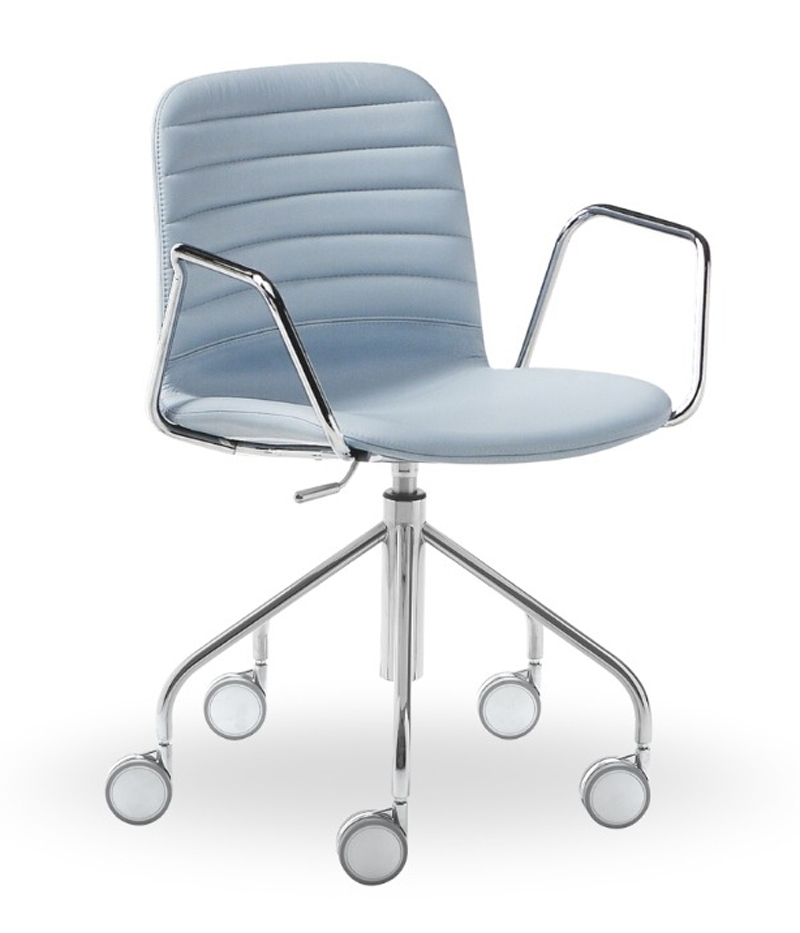 fauteuil de bureau Liù pivotante et réglable en hauteur. La base est à cinq branches sur roulettes, et la coque de l'assise est recouverte de cuir, simili-cuir ou tissu.