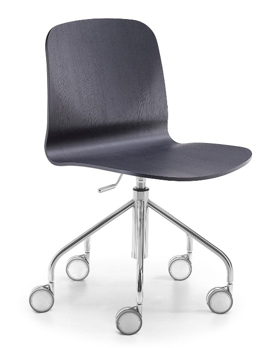 Design Archirivolto, 2013 Dimensions : l 70/... x h x p cm chaise de bureau Liù sur roulettes, pivotante et réglable en hauteur. La base à cinq branches est en métal, et la coque est en bois.