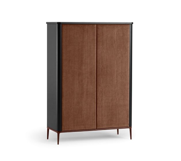 Design Paolo Vernier, 2019 Dimensions : l 92 x h 132 x p 40 cm Buffet Lea avec pieds en métal. Plateau et portes personnalisables avec différents matériaux. Disponible en trois dimensions différentes.