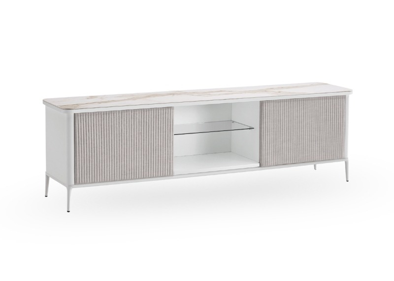 Design. Paolo Vernier, 2019 Dimensions : l 180 x h 55 x p 40 cm Buffet Lea avec pieds en métal. Plateau et portes personnalisables avec différents matériaux. Disponible en trois dimensions différentes.