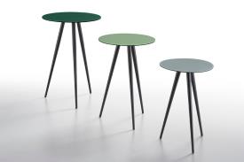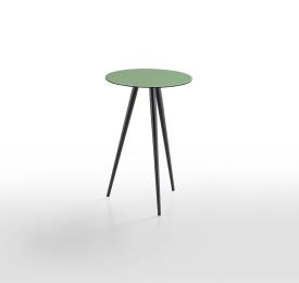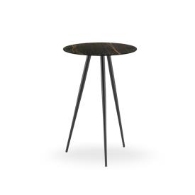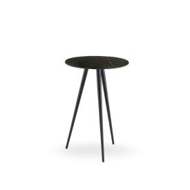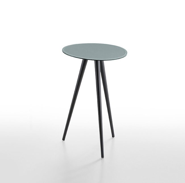 Table basse Trip avec base à trois pieds en métal. Plateau disponible en cristal-céramique ou revêtu de cuir ou cuir toscan. Disponible en trois dimensions différentes : H45 cm Ø30, H50 cm Ø35, H60 cm Ø40.