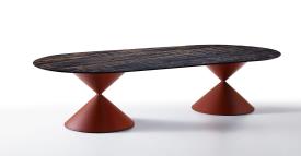 Midj Design Paolo Vernier, 2019 Dimensions : l 300 x h 76 x p 150 cm La table Clessidra Double se distingue par sa structure à double base, qui garantit stabilité et esthétique originale. Le plateau est disponible en bois, cristal-céramique, verre ou marbre, tandis que la structure métallique personnalisable offre de nombreuses possibilités de configuration. Parfaite pour les espaces résidentiels et professionnels nécessitant un élément de mobilier distinctif et fonctionnel. Piétement : métal
